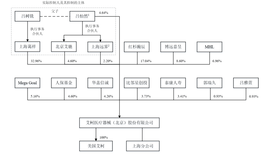 不过,多次增资也使得艾柯医疗的股权结构较为分散。截至招股书签署日,上海蔼祥持有艾柯医疗32.96%股份,为该公司的控股股东;实际控制人为吕树铣及吕怡然父子二人,合计控制该公司44.40%股份。