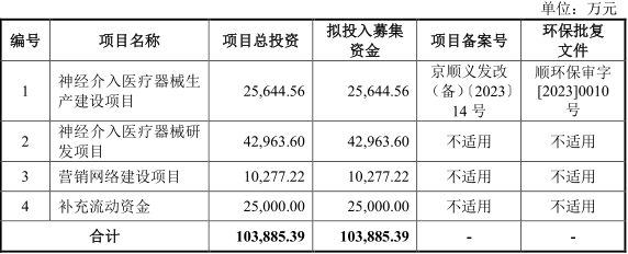 根据招股书所示,本次IPO,艾柯医疗拟公开发行人民币普通股(A股)不超过1436.14万股,拟募集资金10.39亿元,将全部用于“神经介入医疗器械生产建设项目”“神经介入医疗器械研发项目”“营销网络建设项目”及补充流动资金。