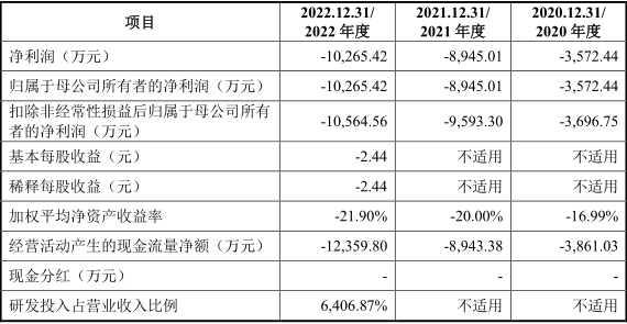 招股书显示,2020-2022年,艾柯医疗的主营业务收入分别为0、0、89.15万元,收入几乎可以忽略不计,但同时分别亏损0.36亿元、0.89亿元、1.03亿元,三年合计亏损超2亿元。公司目前几乎零营收、连续亏损。