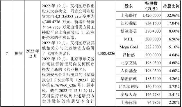 查阅招股书可以发现,成立以来艾柯医疗经历了七次增资及两次股权转让,注册资本从1000万元增长至4308万元,总资产规模同样有所增长。增资价格更是从以1元/注册资本暴涨至90.90元/注册资本,其外部股东包括比邻星创投持、博远资本、红杉中国、华盖资本、泰康保险等。