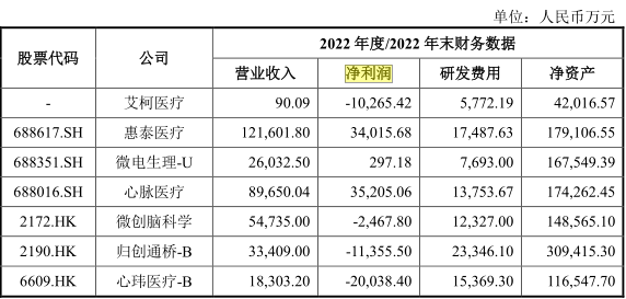 以2022年为例,惠泰医疗、心脉医疗、微创脑科学、归创通桥、心玮医疗几家的研发投入统统都超过亿元。招股书中列出的可比公司中,仅微电生理一家公司2022年研发费用在1亿元以下,为7693万元。