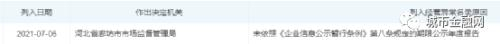 来源:天眼查截图2021年7月6日,廊坊开发区融商村镇银行股份有限公司因“未依照《企业信息公示暂行条例》第八条规定的期限公示年度报告”,被河北省廊坊市市场监督管理局列入经营异常名录。