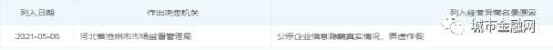 来源:天眼查截图2021年5月6日,沧县农村信用联社股份有限公司因“信息隐瞒真实情况、弄虚作假”,被河北省沧州市市场监督管理局列入经营异常名录。