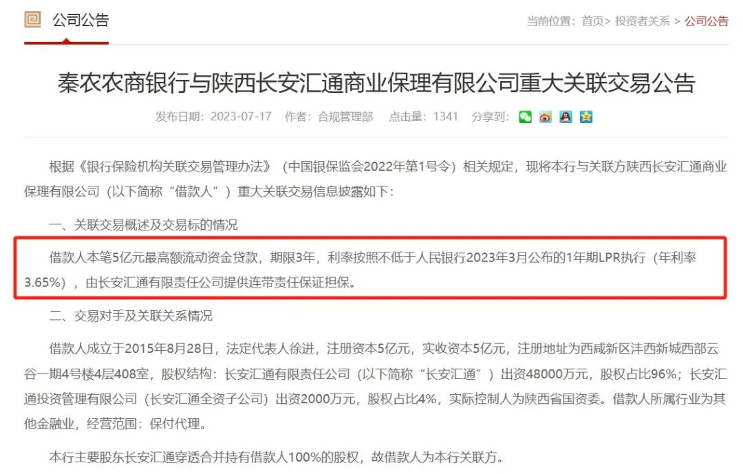 秦农农商行与陕西长安汇通商业保理有限公司的重大关联交易公告显示,借款人本笔5亿元最高额流动资金贷款,期限3年,利率按照不低于人民银行2023年3月公布的1年期LPR执行,由长安汇通有限责任公司提供连带责任保证担保。
