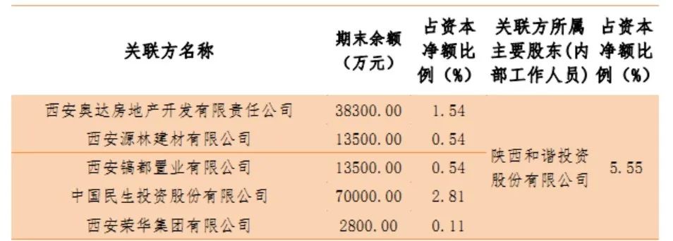 截至2021年末,秦农农商行对单一最大关联方陕西省西咸新区空港新城开发建设集团的关联交易余额为92248万元,占该行资本净额的3.93%;对单个主要股东陕西和谐投资股份有限公司及其控股股东、实际控制人、关联方、一致行动人、最终受益人的合计授信交易余额为240500万元,占资本净额的10.25%;对全部关联方授信余额为618771.88万元,占资本净额的26.37%。