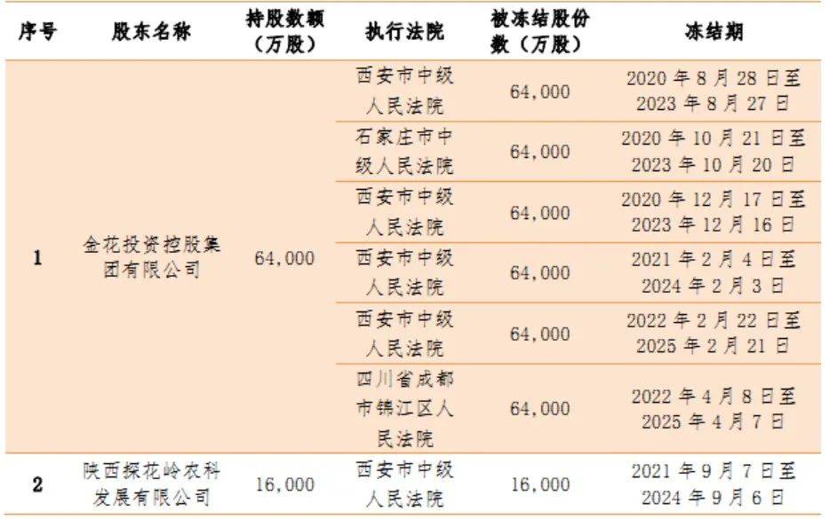 据了解,金花投资控股集团成立于 1995年 7月,注册资本 1.6亿元,主要涉足投资、制药、商贸、酒店及高尔夫等领域与产业,拥有两家上市公司。金花投资控股集团所持秦农农商行64,000万股股份的最终受益人为陕西和谐投资股份有限公司,至2022年末,上述股份因被相关法院执行 6起冻结,尚未完成转让。