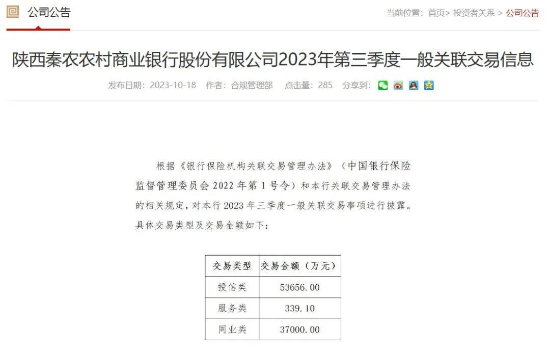 此外,根据秦农农商行最新披露的一般关联交易信息,该行2023年第三季度一般关联交易的类型和交易金额为:授信类交易5.37亿元,服务类交易339万元,同业类交易3.7亿元。
