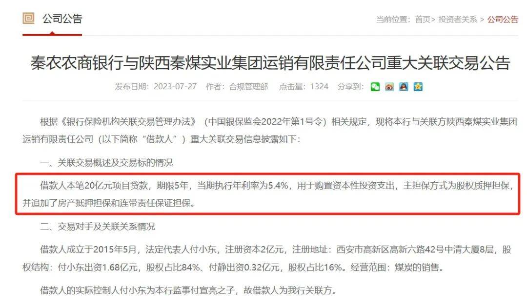 7月,秦农农商行与陕西秦煤实业集团运销有限责任公司的重大关联交易公告显示,借款人本笔20亿元项目贷款,期限5年,当期执行年利率5.4%,主担保方式为股权质押担保,并追加房产抵押担保和连带责任保证担保。