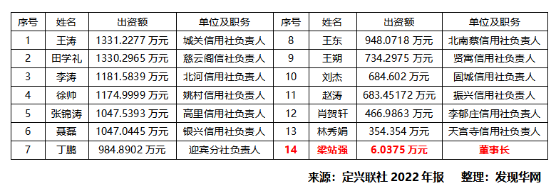 2017年11月28日,保定银监分局批复核准定兴县农村信用联社股份有限公司的定向募股方案。同意定兴联社定向募集股本金68000万股,每股面值为1元(人民币),每股搭售不良资产1元(人民币)。据国家企业信用信息系统公示,定兴联社2022年报填报的部分股东有王涛出资额为1331.2277万元、田学礼出资额为1330.2965万元、李涛出资额为1181.5839万元、徐帅出资额为1174.9999 万元、张锦涛出资额为1047.5393 万元、聂磊出资额为1047.0445 万元、丁鹏出资额为984.8902万元、王东出资额为948.0718 万元、王朔出资额为734.2975 万元、刘杰出资额为684.602 万元、赵涛出资额为683.45172 万元、肖贺轩出资额为466.9863 万元、林秀娟出资额为354.354万元,而董事长梁站强出资额仅6.0375万元,是到任时间晚而误了这饕餮盛宴吗?上述职工自然人全部为下属信用社负责人,并非普通职员。