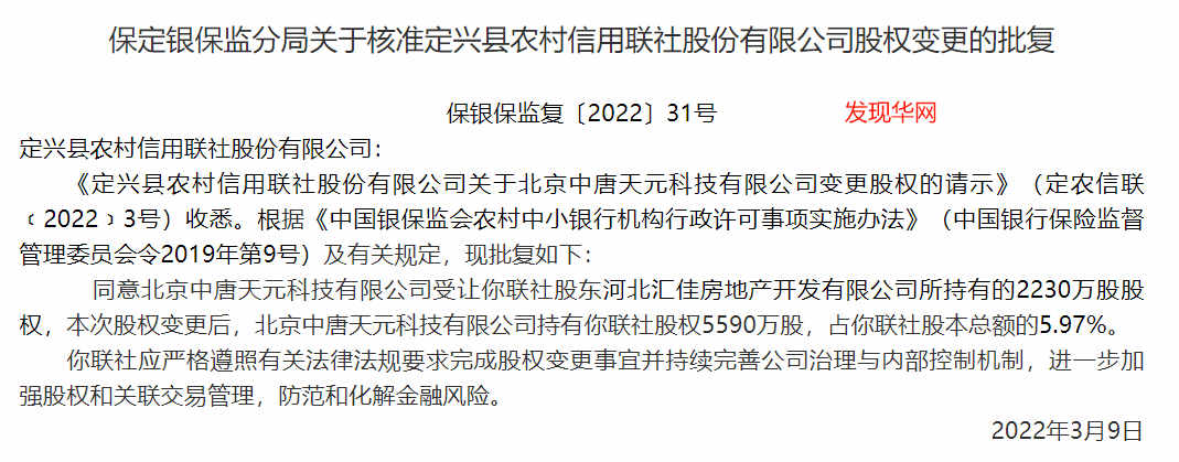 2022年3月9日,保定银保监分局批复同意北京中唐天元科技有限公司受让河北汇佳房地产开发有限公司所持有的定兴联社2230万股股权,本次股权变更后,北京中唐天元科技有限公司持有定兴联社股权5590万股,持股比例为5.97%。