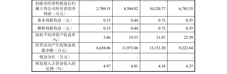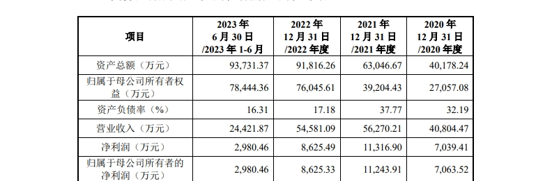 业绩方面,营业收入呈现波动态势,2020年度、2021年度、2022年度、2023年上半年公司营业收入分别为4.080亿元、5.627亿元、5.458亿元、2.442亿元。深交所在问询函中指出,钧崴电子2023上半年营业收入同比下降了11.54%,其中,2023年一季度营业收入同比下降了32.05%,第二季度经营业绩略有好转。