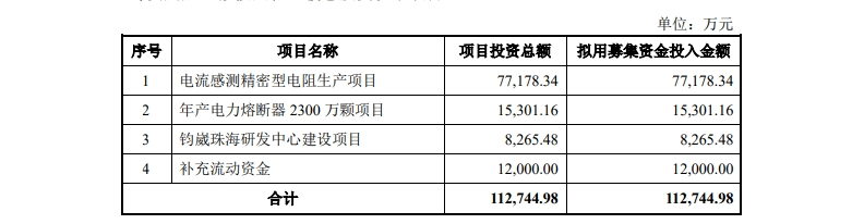 据招股书,钧崴电子本次拟公开发行股票不低于6666.67万股,募集资金投入金额约为11.27亿元,本次募集资金运用均围绕主营业务进行,主要包括电流感测精密型电阻生产项目、年产电力熔断器2300万颗项目、钧崴珠海研发中心建设项目及补充流动资金,其中补充流动资金计划投入1.2亿元。