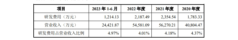 然而,与远高于行业均值的毛利率相对应,钧崴电子研发费用率却低于同行业可比公司平均值。公司研发项目主要以电流感测精密电阻和熔断器的研发创新为主。报告期内,钧崴电子研发费用分别为1783.33万元、2354.54万元、2187.49万元和1214.13万元,研发费率分别为4.37%、4.18%、4.01%、4.97%,而同行可比公司均值分别达到4.09%、4.34%、5.51%、5.95%。