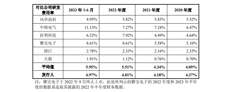 但是问询之前,钧崴电子为何在招股书中将中熔电气、好利科技研发费用计入平均值呢?而在问询函的回复报告中又将其剔除出去,原因不得而知。