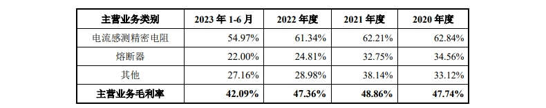 其中公司主营业务之一电流感测精密电阻的毛利率分别为62.84%、62.21%、61.34%、54.97%,同行业可比公司毛利率平均值分别为33.00%、33.24%、25.40%、21.96%。钧崴电子主营业务整体毛利率及上述产品毛利率明显高于同行业可比公司平均值。