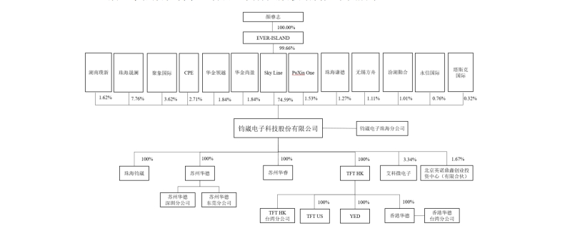 截至最新招股说明书签署日,EVER-ISLAND持有SkyLine公司99.66%的股权,而SkyLine直接持有钧崴电子1.492亿股股份,持股占比74.59%,为钧崴电子的控股股东。EVER-ISLAND通过SkyLine间接控制钧崴电子1.492亿股股份,为钧崴电子的间接控股股东。同时,颜睿志持有EVER-ISLAND100%股权。也就是说,颜睿志控制钧崴电子74.59%的股权。
