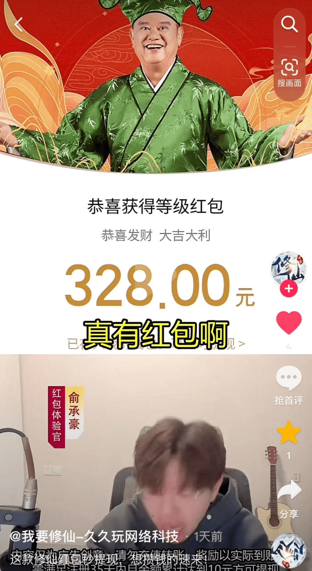 “我要修仙”的广告花样繁多,广告宣称“如果没钱,着急用钱、还不想管人借钱、想攒生活费的,请下载修仙红包手游,新用户注册领328红包,可以反复提现,而且这款游戏是秒提秒到账的。”