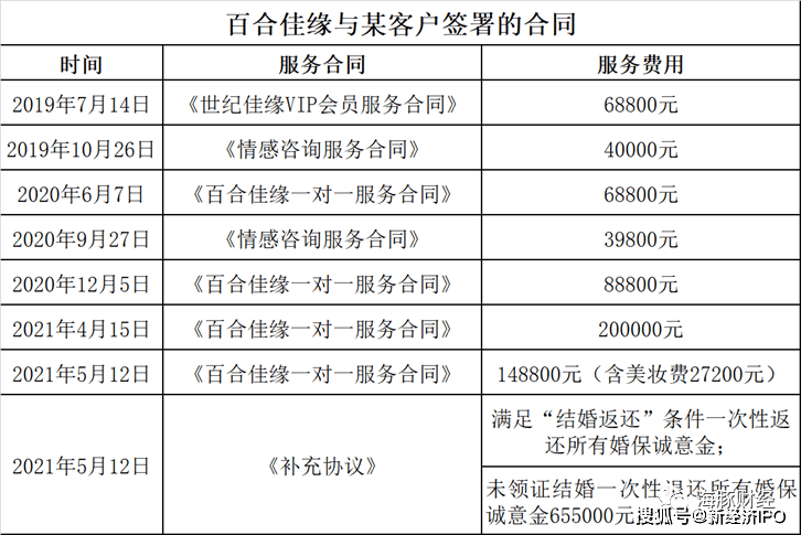 2023年4月8日,中国裁判文书网披露的《贾某婷与北京花千树信息科技有限公司服务合同纠纷二审民事判决书》显示,2019年4月7日、2020年3月26日,贾某婷分别与北京花千树信息科技有限公司(绝对100婚恋网主体,2013年被世纪佳缘收购,简称“世纪佳缘”)签订《百合佳缘一对一服务合同》约定,服务时长12个月,约见人数12人,服务金额68800元。两份合同共计137600元。