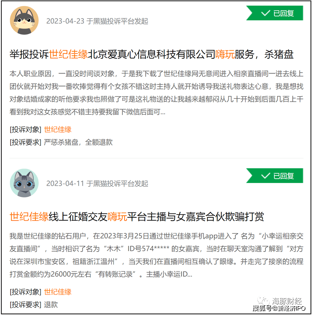 邱某遭遇的情况并非个例。在黑猫平台,有多位网友发帖反映,世纪佳缘红娘(主持人)与女主播联合套路用户,不断怂恿、诱导用户给女主播刷礼物。