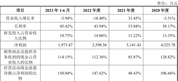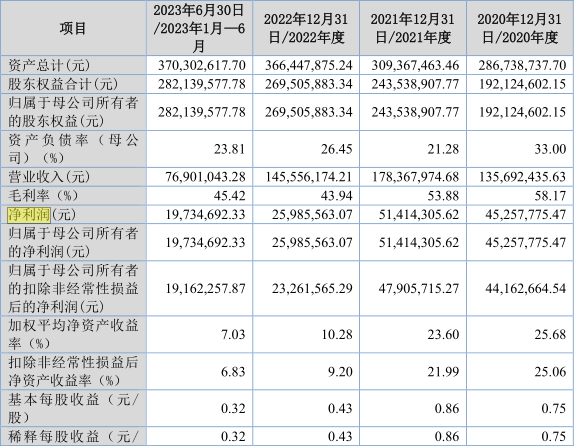 据招股书,2020年-2023年上半年,珠海鸿瑞实现营业收入分别为1.36亿元、1.78亿元、1.46亿元及7690.1万元;取得净利润分别为4525.78万元、5141.43万元、2598.56万元及1973.47万元。
