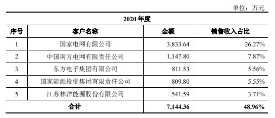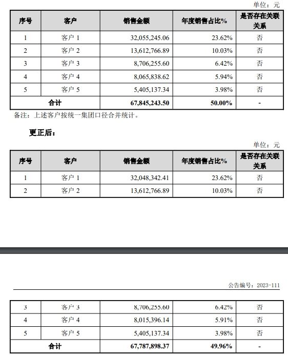同期,珠海鸿瑞还将向第一大客户国家电网的销售金额由3205.52万元调减至3204.83万元,减少0.69万元;向第四大客户国家能源投资集团有限责任公司的销售金额由806.58万元调减至801.54万元,减少5.04万元。至此,公司向前五大客户的销售金额占比由50%降至49.96%。