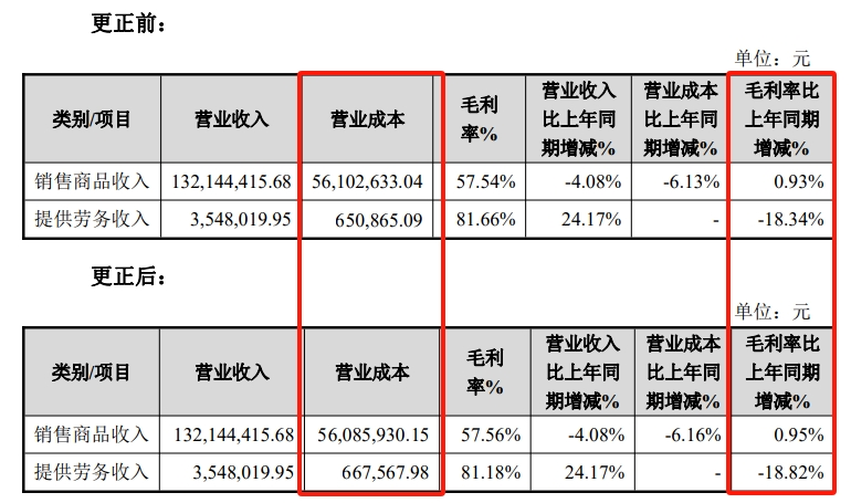 以2020年为例,珠海鸿瑞将销售商品收入的营业成本由5610.26万元调整至5608.59万元,调减了1.67万元;同时,提供劳务收入的营业成本调增了1.67万元。