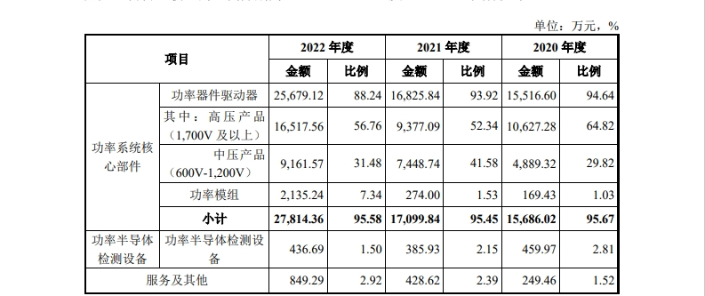 主营业务中,功率器件驱动器作为飞仕得的核心业务,报告期内,其销售收入分别为1.552亿元、1.683亿元和2.568亿元,占公司主营业务收入比例分别为94.64%、93.92%、88.24%。