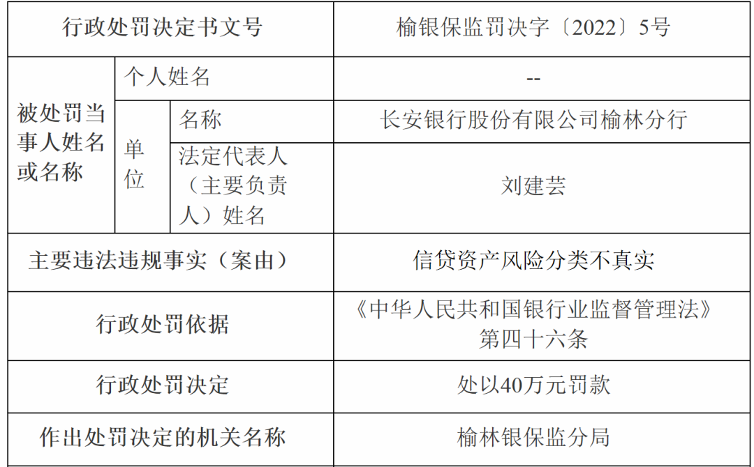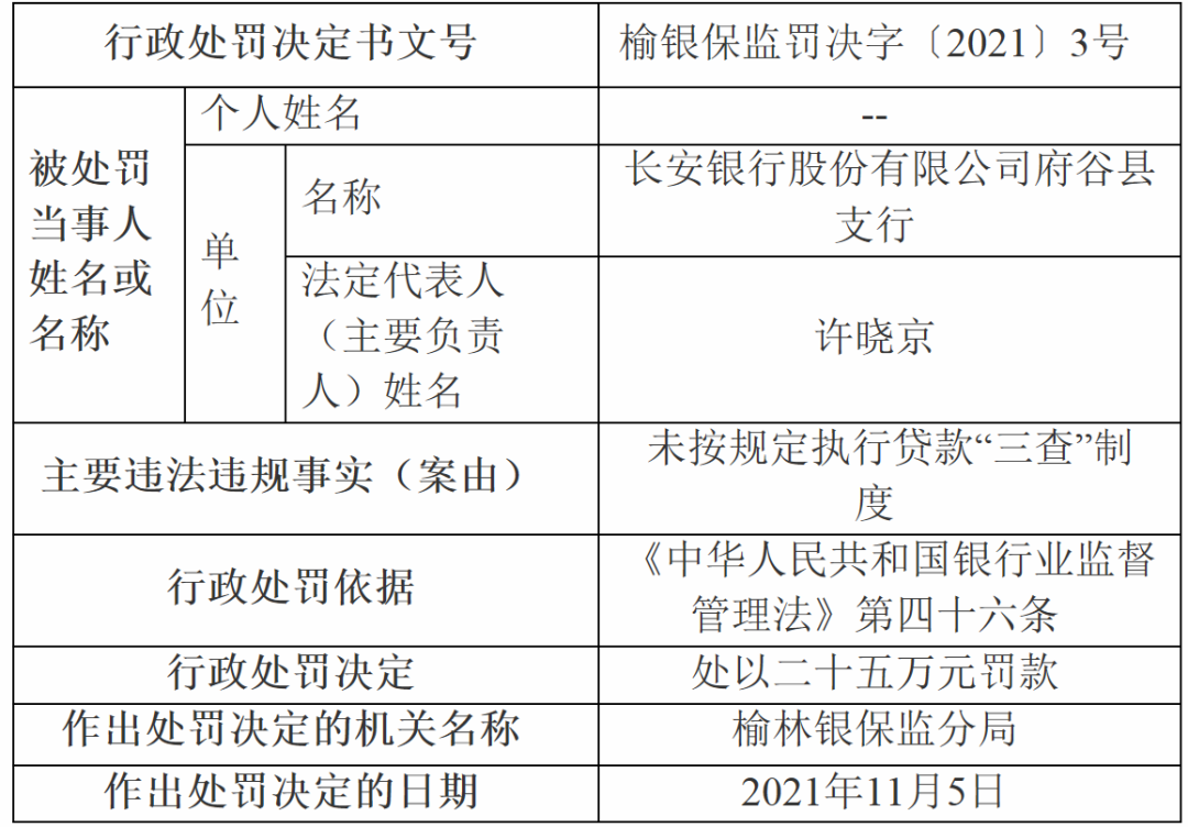 长安银行及旗下分支行在2021年共收到5张罚单,合计约530万元。当年1月,长安银行汉中分行因贷款“三查”制度执行不到位被罚款30万元。4月,长安银行因违反支付结算、反洗钱、货币金银、国库、征信管理规定被警告并处420.8万元罚款。6月,长安银行铜川分行因违规向资本金不足的项目发放固定资产贷款被罚款30万元。11月,长安银行府谷县支行因未按规定执行贷款“三查”制度被罚款25万元等。