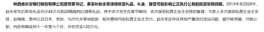 比如,长安银行前董事长成为腐败典型。2022年12月,中央纪委国家监委对10起违反中央八项规定精神典型问题进行公开通报,其中就包括长安银行原党委书记、董事长赵永军违规收受礼品、礼金,接受可能影响公正执行公务的旅游安排问题。经查,2013年至2020年,赵永军先后收受礼金共计45万元和20箱高档白酒等礼品,多次接受私营企业主安排的宴请、旅游。赵永军还存在其他严重违纪违法问题,被开除党籍、开除公职,判处有期徒刑十一年零六个月,并处罚金120万元。