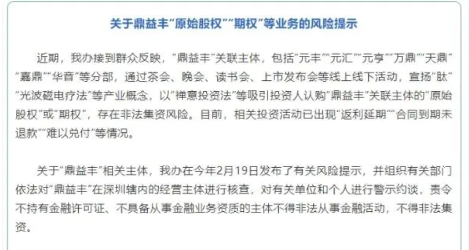 目前,深圳金融监管部门已经多次发文表示鼎益丰“存在非法集资风险”。各位千万不要被所谓的高息蒙蔽,小心血本无归。