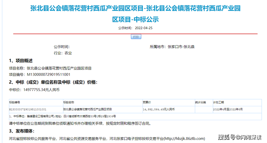 2022年4月25日,张北县公会镇落花营村西瓜产业园区项目-张北县公会镇落花营村西瓜产业园区项目-中标公示,瀚峰建设工程有限公司以14977755.34元中标,招标人为张北县公会镇人民政府。
