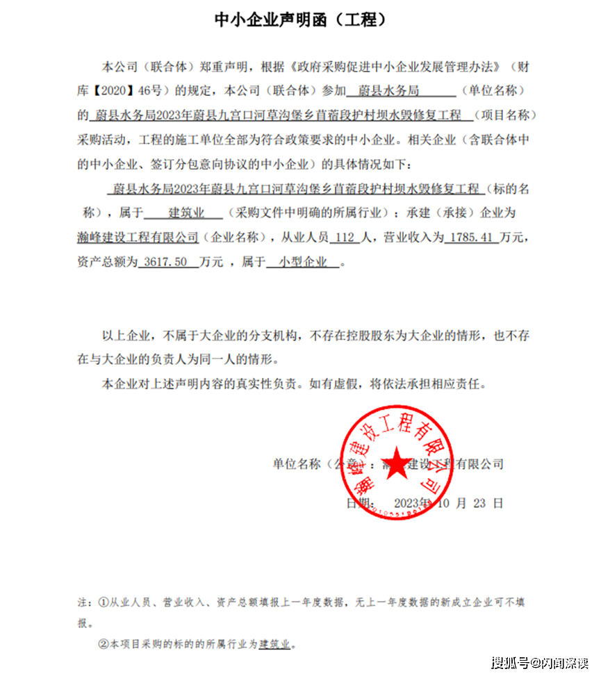 声明函称:蔚县水务局2023年蔚县九宫口河草沟堡乡苜蓿段护村坝水毁修复工程,属于建筑业;承建(承接)企业为瀚峰建设工程有限公司,从业人员 112 人,营业收入为1785.41万元,资产总额为 3617.50 万元 ,属于小型企业 。