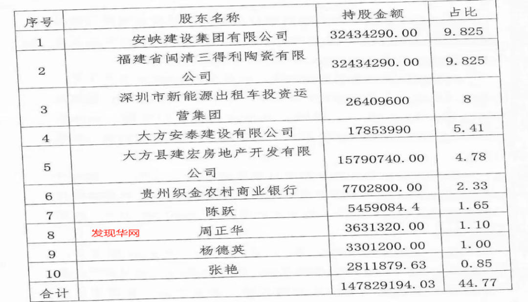 《贵州大方农村商业银行股份有限公司2021年主体长期信用评级报告》披露,截至2021年6月末,大方农商银行实收资本为3.30亿元,前五大股东持股及占比分别是安峡建设集团有限公司持有32434290股(持股比例为9.825%)、福建省闽清三得利陶瓷有限公司持有32434290股(持股比例为9.825%)、深圳市新能源出租车投资运营集团有限公司持有26409600股(持股比例为8.00%)、大方安泰建材有限公司持有17853990股(持股比例为5.41%)、大方县建宏房地产开发有限公司持有15790740股(持股比例为4.78%)。