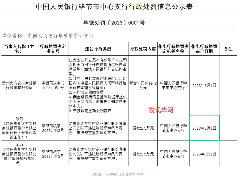 然而就在2023年8月3日,贵州大方农村商业银行股份有限公司因存在“为企业开立基本存款账户未立即至迟于当日将开户信息通过账户管理系统向当地人民银行分支机构备案;开立一般存款账户未在5个工作日内向中国人民银行人民币银行结算账户管理系统备案;未按规定收缴假币;向金融信用信息基础数据库提供个人不良信息,未事先告知信息主体本人;未按规定重新识别客户”等违法违规行为,被中国人民银行毕节市中心支行决处以罚款44.2万元并警告,时任副行长耿丹被处以罚款2.5万元,时任合规风险部总经理余力被处以罚款2.5万元。不懂就问,原副行长耿丹、原合规风险部总经理余力被罚款项是自己掏腰包还是大方农商行支付?