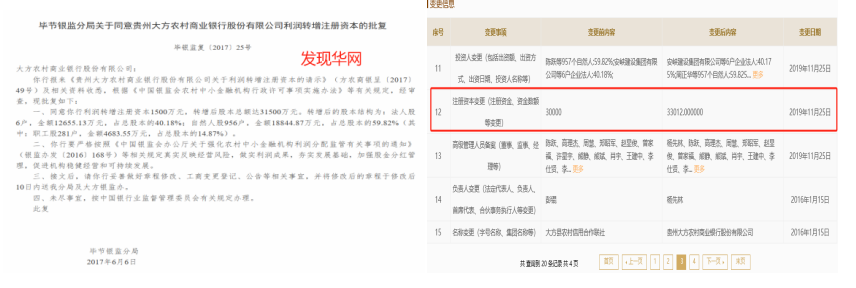 国家企业信用信息公示系统显示,2019年11月25日,大方农商行注册资本由30000万元变更为33012万元。