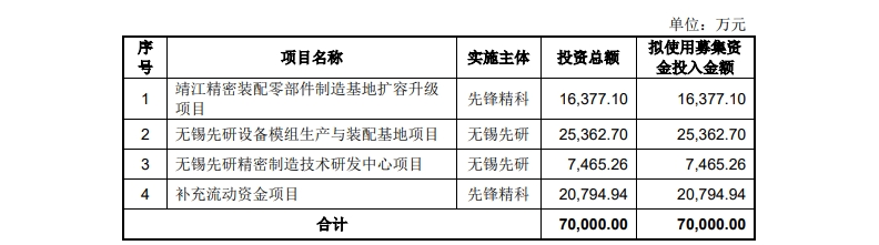 从募资情况来看,本次IPO拟发行不超过5059.50万股,募集资金7亿元,先锋精科决定将募集资金投向靖江精密装配零部件制造基地扩容升级项目、无锡先研设备模组生产与装配基地项目、无锡先研精密制造技术研发中心项目以及补充流动资金项目,其中补充流动资金达到2.079亿元。
