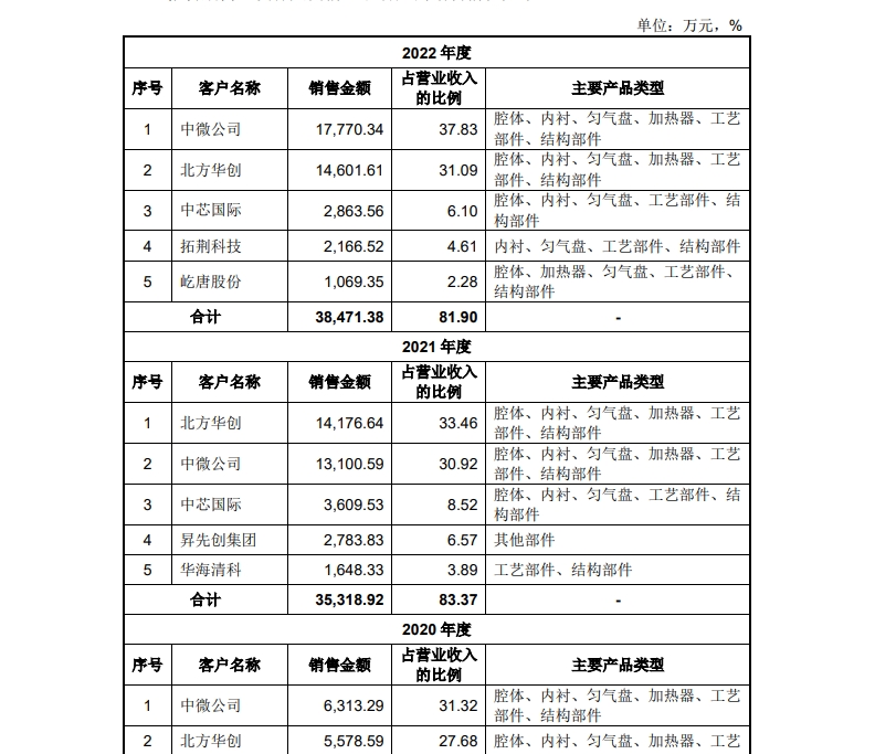 值得注意的是,先锋精科的第一大客户中微公司同时属于公司前十名股东之一。据招股书,中微公司在2017年、2018年就是先锋精科的前三名销售客户了,报告期内,中微公司销售金额占营业收入比重分别为31.32%、30.92%、37.83%,占比较重。