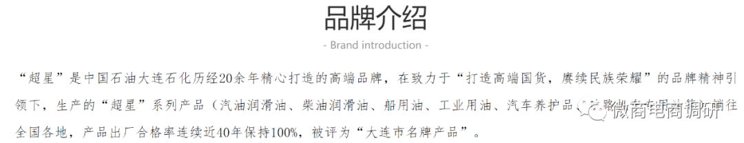 据超星(大连)石化科技有限公司官网显示,“超星”是中国石油大连石化历经20余年精心打造的高端品牌,该公司也在其官方公众号中多次提到超星润滑油为中石油大连石化的自主品牌。