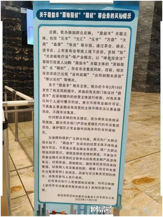 此前,深圳金融局已不止一次针对鼎益丰发布了风险警示函。2023年2月,深圳金融局方面称,鼎益丰在深圳的经营主体不持有金融许可证、不具备从事金融业务资质。11月的通知中则更加明确提示了,目前鼎益丰已出现难以兑付的情况。