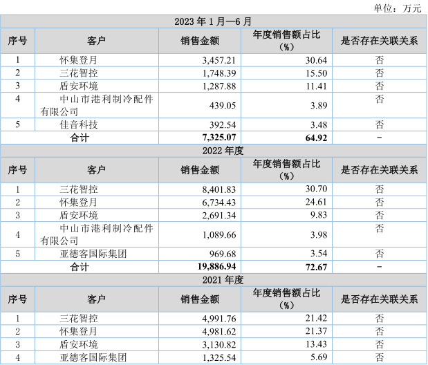 其中,报告期内,三花智控一直为金则利占据排名前两位的大客户。根据招股书,报告期内,三花智控的销售额分别为2,659.49万元(占比15.71%)、4,991.76万元(占比21.42%)、8,401.83万元(30.70%)、1,748.39万元(占比15.50%)。