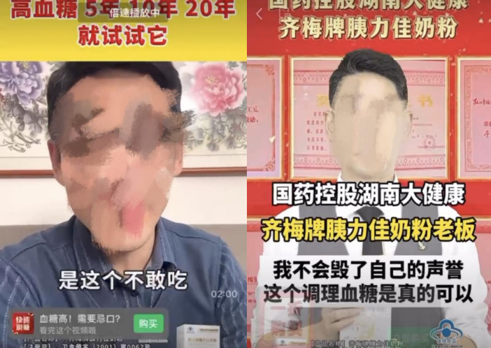 在“齐梅调糖奶粉”微信视频号发布的一条“齐梅牌胰力奶粉”广告中,某广告参演人员面对镜头,并用手举着一张无法被清晰识别的身份证件“实名”称,该奶粉让他的血糖从20多点降到了6点多,并称自己只用了一盒,一年没有反复。广告暗示,不论高血糖多少年,只要两盒便能减轻症状,包括“口干口渴”、“自汗盗汗”及“手麻脚麻”等,并称“吃下去十秒钟就会觉得全身非常舒服”,有“稳定血糖”的效果。