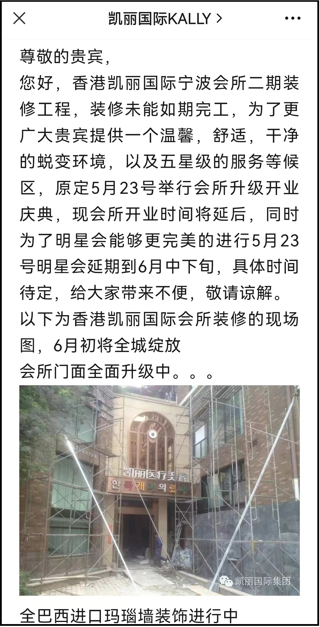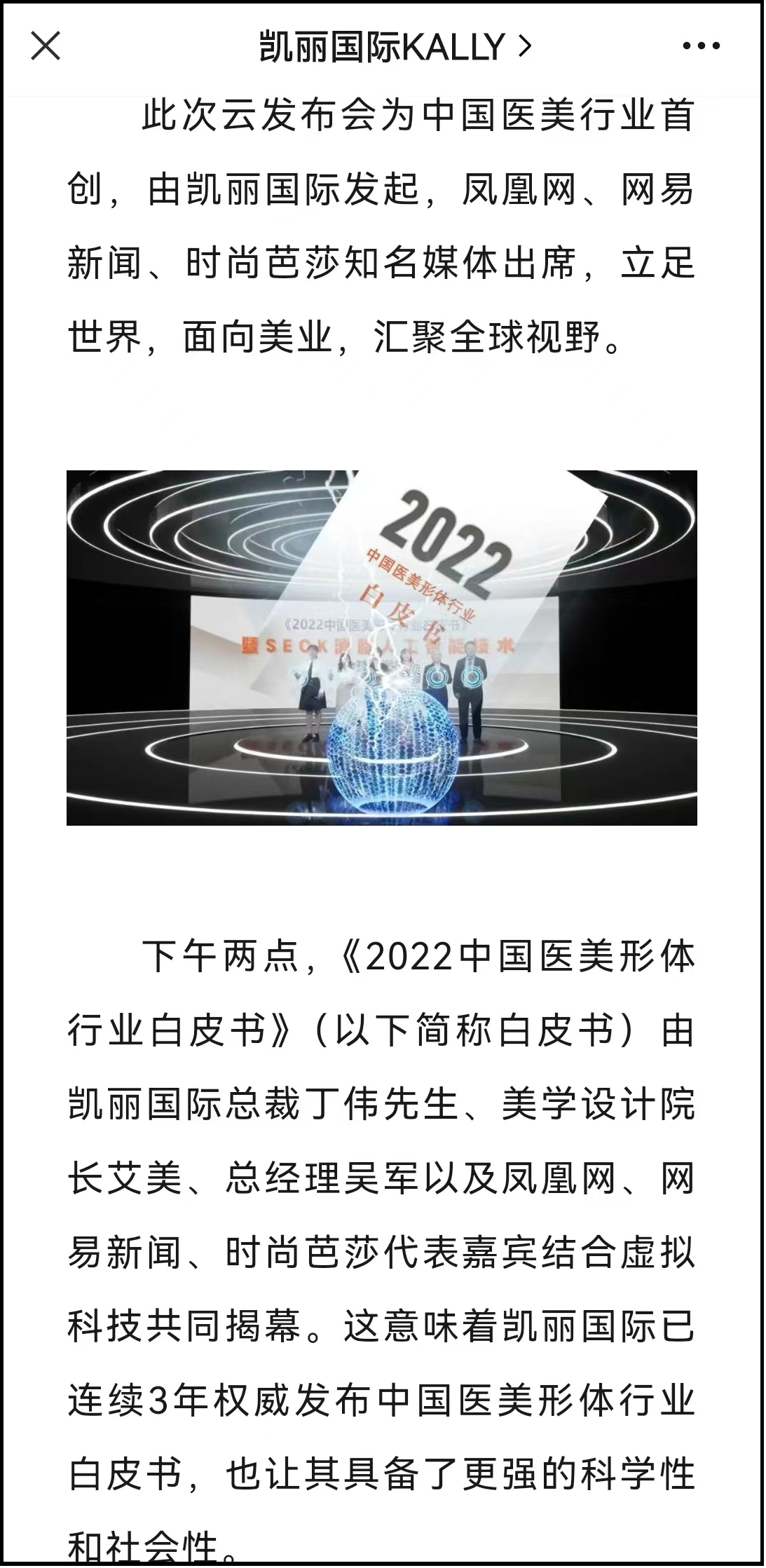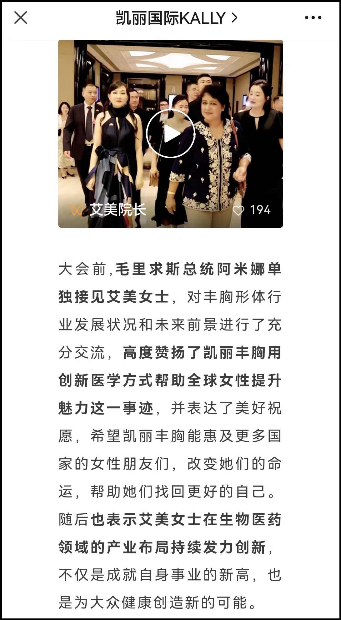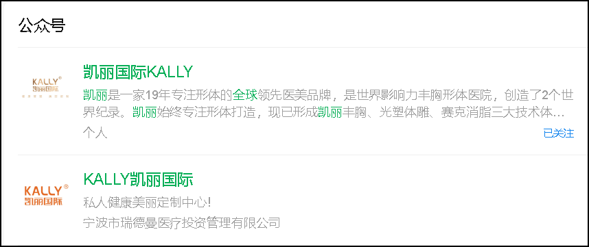 本刊在微信公众号“凯丽国际KALLY”查询发现,这家名为“凯丽”,专注形体19年的全球领先医美品牌,世界影响力丰胸形体医院,创造了2个世界纪录的注册主体竟然是“个人”。而另外一个微信公众号“KALLY凯丽国际”则显示为宁波市瑞德曼医疗投资管理有限公司,但后者从2022年6月3日后便再没有更新内容。