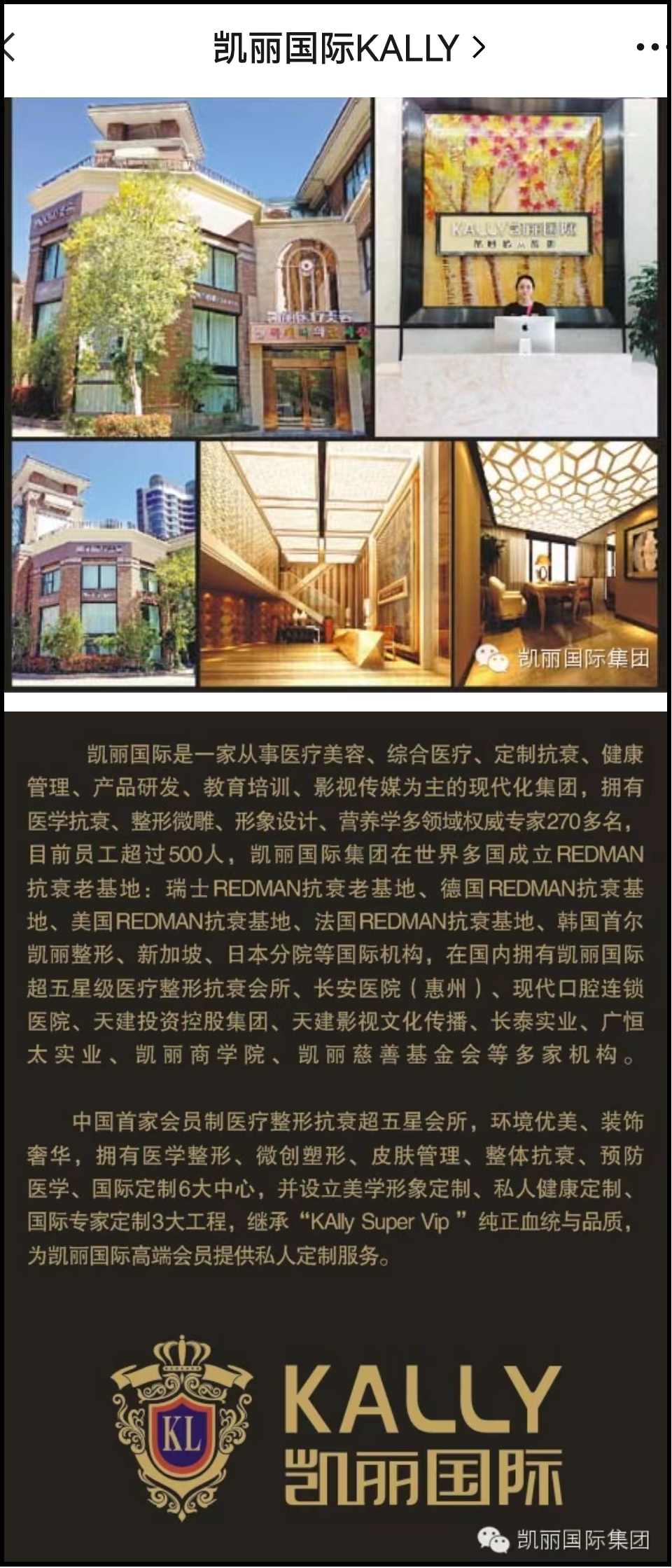 同时,《商讯》在“凯丽国际”相关各个网络平台发布的宣传信息中发现,该医美机构宣称其背后是英国凯丽医疗控股集团,是一家国际化医疗美容抗衰老、私人健康管理、行政健康管理等高端私人医疗与健康管理机构。