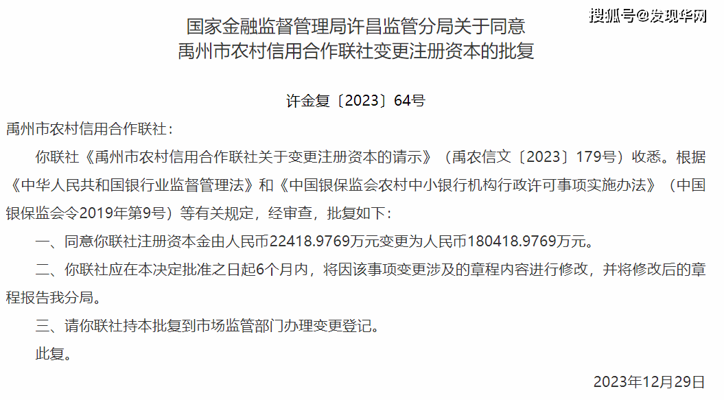 此前不久,禹州联社刚刚获国家金融监督管理总局许昌监管分局批复,核准禹州联社注册资本金由人民币22418.9769万元变更为180418.9769万元。