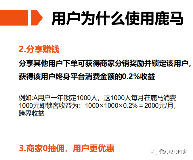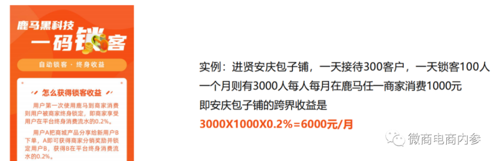 4. 锁客收益百分之二(商家入驻越早,锁客人数越多,收益越高),假设A用户第一次使用鹿马是到B商家消费,则A被B商家终身锁定,则B享受A终身在鹿马消费流水的百分之二;假设B餐饮店使用鹿马锁定3000人,被锁定的用户每月在鹿马任意商家消费1000元,则B的收入为3000X1000=300万X2%=6000元/月。这个锁客收益也被称为“跨界佣金”。