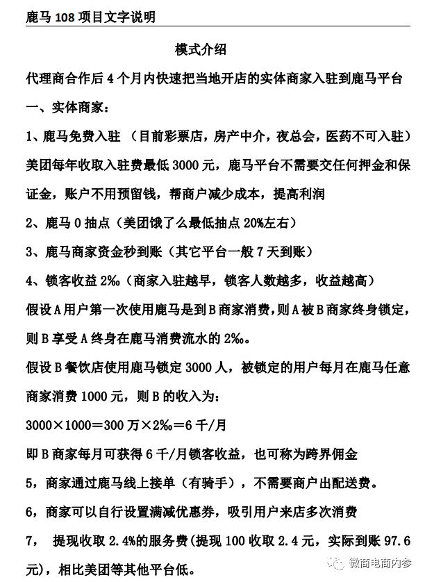 关于模式本身,推广人员提供的《鹿马108项目文字说明》从以下三个方面进行了解读: