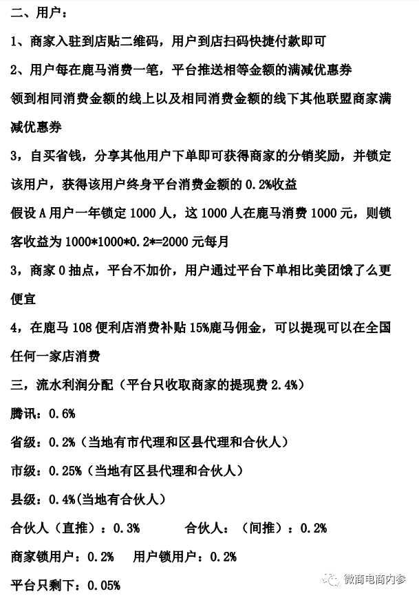 在本篇报道中,我们了解到了鹿马108是一家怎样的平台,其模式有哪些特色,下篇报道中,我们将着重关注的是在鹿马108的模式中出现的“股权”到底是怎么一回事,请继续关注微商电商内参。