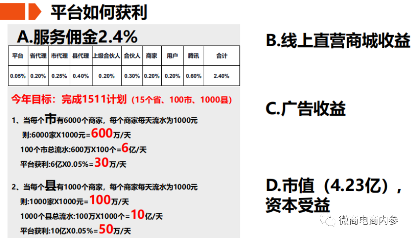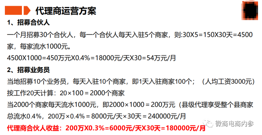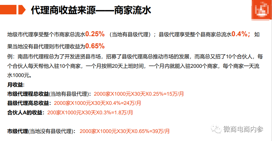 2,区县级代理,享受当地商家总流水0.4%(当地有合伙人),当地没有合伙人,则县代理收益为0.7%