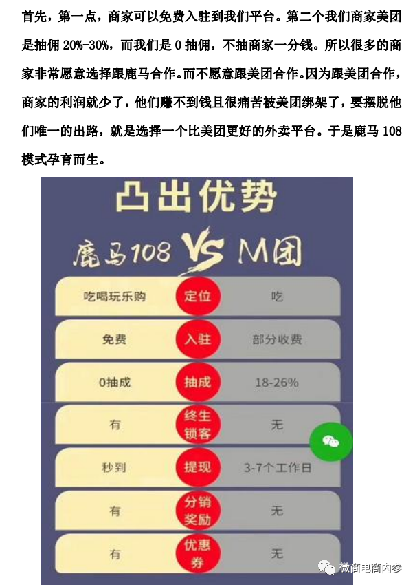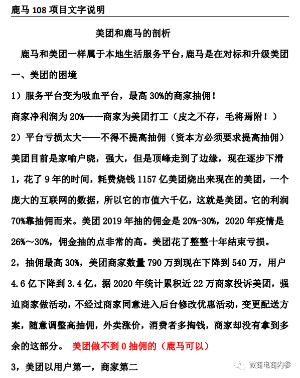 这份资料甚至明确声称美团是“服务平台变为吸血平台”,同时还表示:“很多的商家非常愿意选择跟鹿马合作,而不愿意跟美团合作。因为跟美团合作,商家的利润就少了,他们赚不到钱且很痛苦被美团绑架了,要摆脱他们唯一的出路,就是选择一个比美团更好的外卖平台,于是鹿马108模式孕育而生。”