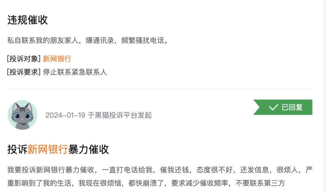 截至2024年1月31日,在黑猫投诉平台上,新网银行共收到投诉4669条,内容包括:遭遇变相砍头息、乱扣费、暴力催收、违规放贷等。在知乎等社交平台上,也有不少网友求助,如何解决被新网银行暴力催收的问题。
